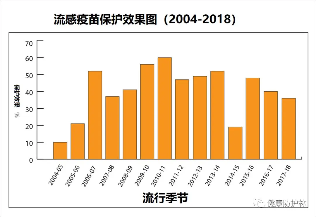 每年接种流感疫苗是经过证实的预防流感最有效的手段。但是,这句话其实包含2层意思。一是相对于其他各种方法,目前人类暂时没有更好的措施了;二是虽然流感疫苗“尽力了”,但是也有扛不住的时候。我们来看下美国疾控中心发布的连续10多年的数据,计算方法很简单,在确诊流感的患者和没有感染流感的对照组里面来比较一下接种疫苗的多还是不接种疫苗的多,如果接种疫苗的人感染的风险低,提示疫苗起到了保护作用。从这张图可以看到,疫苗肯定是起保护作用了,只不过有时候保护的效果没有那么突出,在某一些年份显得没有那么“管用”。大家看,保护效果在10-60%间波动,这不是说打了流感疫苗的人里面10%的人不得流感,其他90%就得了流感,而是说打了流感疫苗和不打流感疫苗相比,感染风险出现了下降。越接近于100%说明保护效果越好。